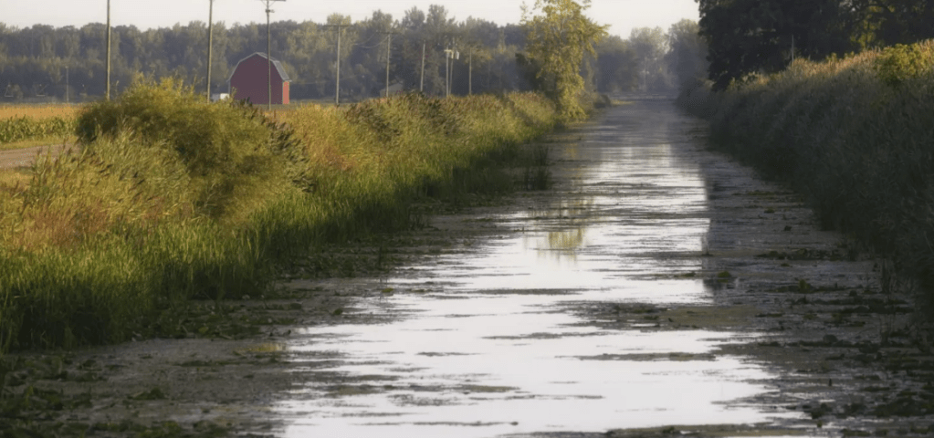 Nitrogen and phosphorus drain from cropland and livestock operations into swollen ditches like this one in Michigan. Photo © J. Carl Ganter/Circle of Blue