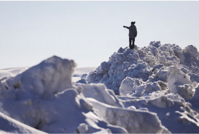 A resident surveys the massive amount of snow that has trapped residents of mountain towns near Crestline, in San Bernadino County, U.S. March 2, 2023