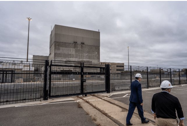 Chris Clark and Randy Fordice of Xcel Energy walk outside of the company’s nuclear generating plant in Monticello, Minn., during an October 2019 tour. Officials on Thursday acknowledged a radioactive water leak occurred at the plant last November