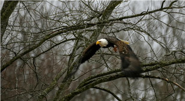 An eagle takes flight near the Shiawassee River. The Shiawassee National Wildlife Refuge and its extensive wetland restorations have benefitted from settlement money. Eagles, ducks, herons, fish, otters, many other kinds of wildlife flourish because of restored sites.