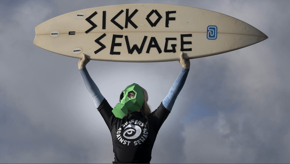 A protest in November 2022 against sewage discharges at an overflow pipe on Long Rock Beach in Penzance, Cornwall