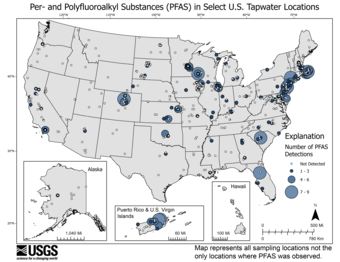 This USGS research marks the first time anyone has tested for and compared PFAS in tap water from both private and government-regulated public water supplies on a broad scale throughout the country. Those data were used to model and estimate PFAS contamination nationwide. This USGS study can help members of the public to understand their risk of exposure and inform policy and management decisions regarding testing and treatment options for drinking water.