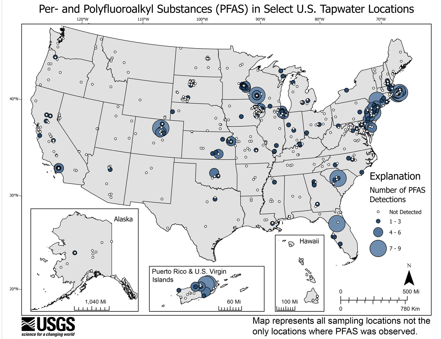 “Most of the exposure was observed near urban areas and potential PFAS sources,” according to the July 5 news release. “This included the Great Plains, Great Lakes, Eastern Seaboard, and Central/Southern California regions. The study’s results are in line with previous research concluding that people in urban areas have a higher likelihood of PFAS exposure. USGS scientists estimate that the probability of PFAS not being observed in tap water is about 75% in rural areas and around 25% in urban areas.”