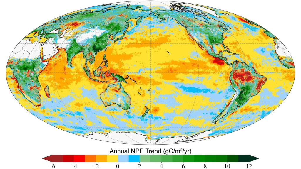 For this study, the team explored annual trends and variability in global net primary production, with a focus on the interplay between land and ocean ecosystems.